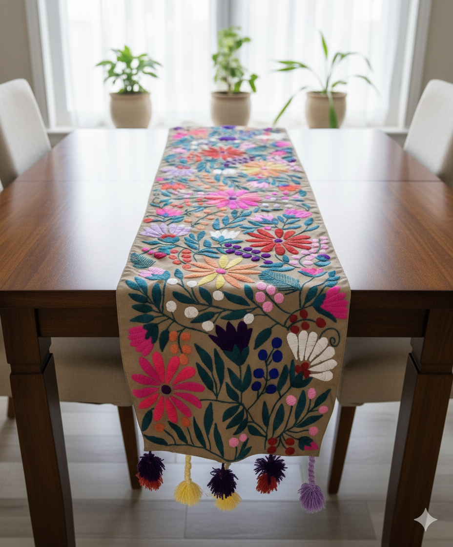 رانر سفرة مطرز يدويًا ومبطن بمقاس 250×75 سم، يتميز بتصميم أنيق ودقة عالية في التطريز ليضيف لمسة فنية راقية إلى ديكور المائدة. صُنِع في مصر بعناية من أجود أنواع الخامات ليعكس إبداع الحرف اليدوية المصرية.