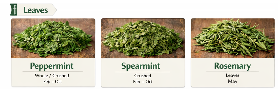 تُزرع أوراقنا المجففة في ظروف مُحكَمة، ويتم معالجتها باستخدام تقنيات تجفيف حديثة لضمان جودة ثابتة، ونضارة عالية، وفترة صلاحية طويلة. النعناع الفلفلي (Peppermint) – كامل / مجروش | الموسم: من فبراير إلى أكتوبر النعناع البلدي (Spearmint) – مجروش | الموسم: من فبراير إلى أكتوبر إكليل الجبل (Rosemary) – أوراق | الموسم: مايو