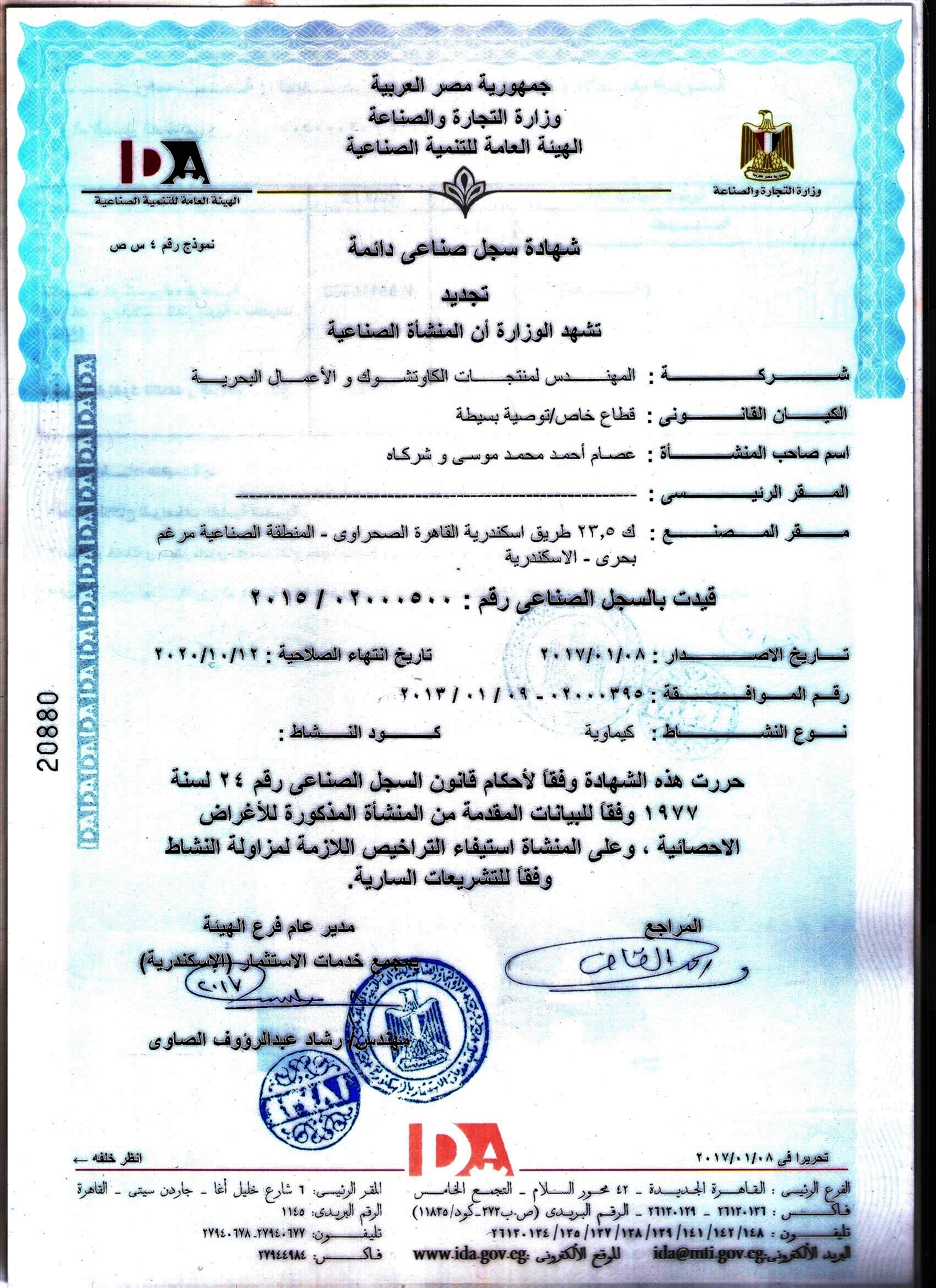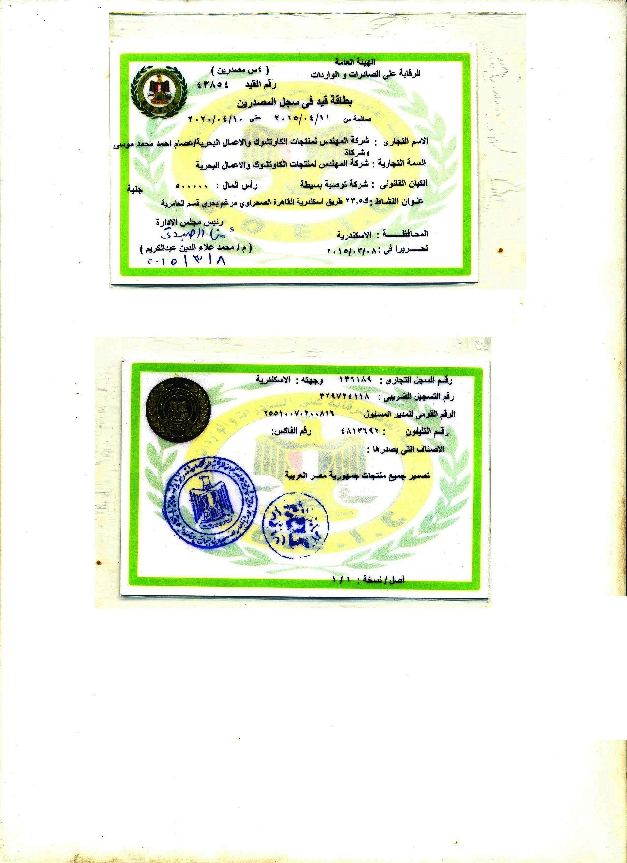 1- التبطين بالمطاط Rubber Lining لمختلف المعدات 2- مصدات السفن بالموانئ البحرية (الفنادر) بأنواعها المختلفة Fenders 3- غطاء فتحات عنابر التخزين بسفن نقل البضائع Hatch Cover 4- فرش ارضيات مطاطية Rubber Flooring 5- شيت مطاطى Rubber Sheeting 6- اسطمبات مطاطية مختلفة للخراطيم المطاطية وغيرها Rubber Molding 7- المذيبات الصناعية (مضادات الشحوم Degreaser) مثل Trichloroethylene