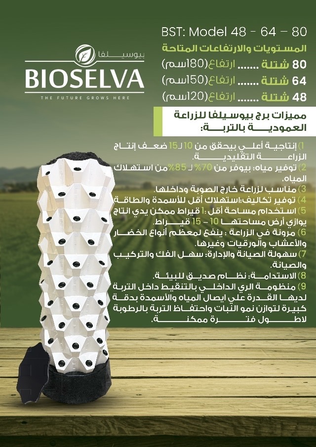 برج الزراعة الرأسية من Bioselva نظام مبتكر يعتمد على التربة، يضاعف الإنتاجية حتى 15 مرة ويوفر 80% من المياه. مناسب للخضروات والأعشاب والفواكه الصغيرة، ويخدم المزارع التجارية والمنازل.